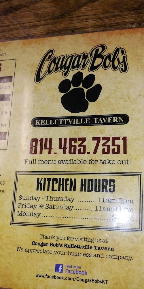 Welcome to Cougar Bob's Kelletville Tavern, your ultimate dining destination in Tionesta, PA! Nestled along PA-666, our friendly tavern offers a relaxed atmosphere perfect for groups, families, and solo diners alike. Enjoy a diverse menu featuring hearty grilled dishes, traditional favorites, and a fantastic selection of beers and cocktails. With options for takeout, delivery, and late-night service, we cater to all your cravings. Our accessible facilities ensure everyone can join the fun. Come for delicious meals, exciting games, and lively entertainment—experience the charm of Cougar Bob's today! Reservations are welcome.